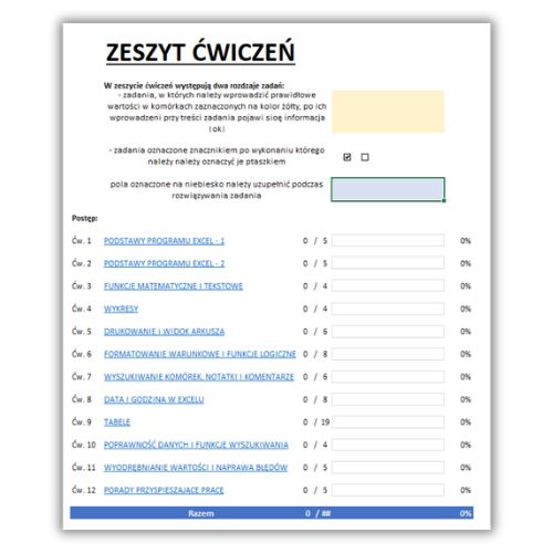 Excelowy zeszyt ćwiczeń z zagadnieniami na poziomie podstawowym zawiera 79 zadań do samodzielnego rozwiązania.