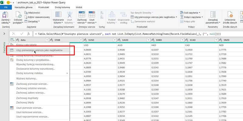 Następnie musimy usunąć dwa pierwsze wiersze „Usuń wiersze -> Usuń pierwsze wiersze” oraz usuniemy wiesz pusty „Usuń wiersze -> Usuń puste wiersze”. Z górnego narożnika zakresu power query klikamy w ikonę tabeli i z listy rozwijalnej wybieramy „Użyj pierwszego wiersza jako nagłówków.