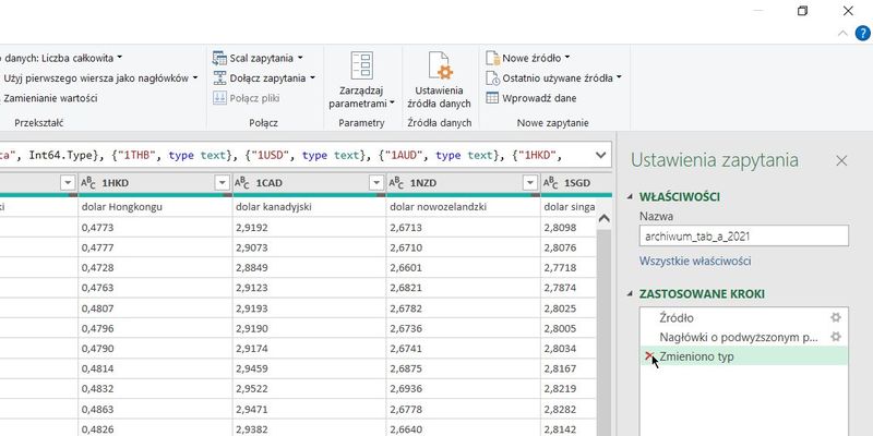 Tym samym pierwszy wiersz wskoczył do nagłówków a power query zamienił typy danych na liczbę dziesiętną, w pierwszej kolumnie zmienimy typ danych na datę (zamień bieżącą)
