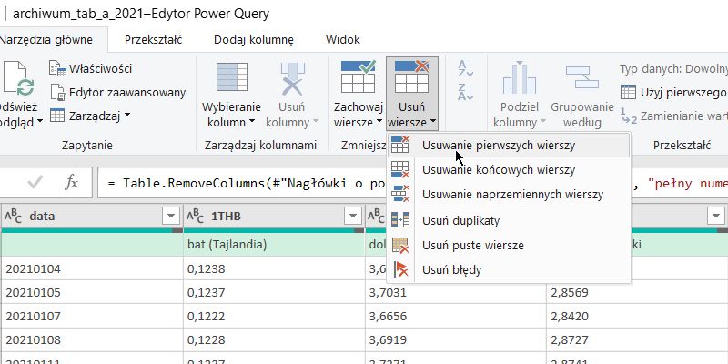 Opis walut w pierwszym wierszu też jest niepotrzebny wybieramy „usuń wiersze -> usuwanie pierwszych wiesz i wpisujemy 1
