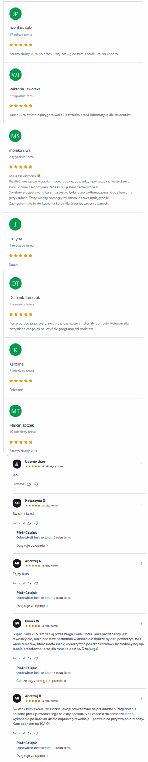 Nazywam się Piotr Czujak. Prowadzę kanał na Youtube o zastosowaniu Excela i jego dodatków tj. Power Query i Power Pivot w pracy i życiu prywatnym. Moje poradniki na kanale youtube mają setki tysięcy wyświetleń.