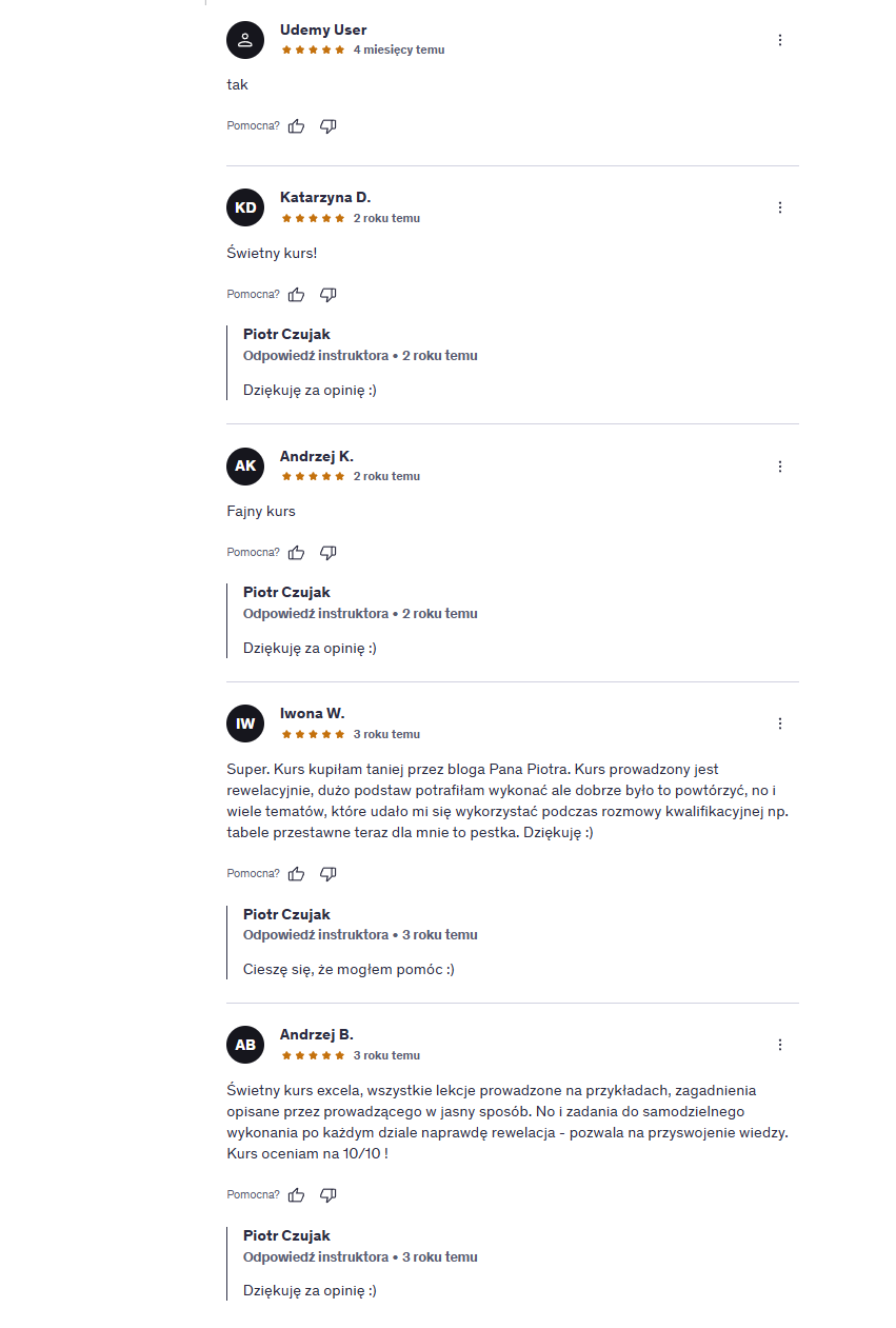 Nazywam się Piotr Czujak. Prowadzę kanał na Youtube o zastosowaniu Excela i jego dodatków tj. Power Query i Power Pivot w pracy i życiu prywatnym. Moje poradniki na kanale youtube mają setki tysięcy wyświetleń.